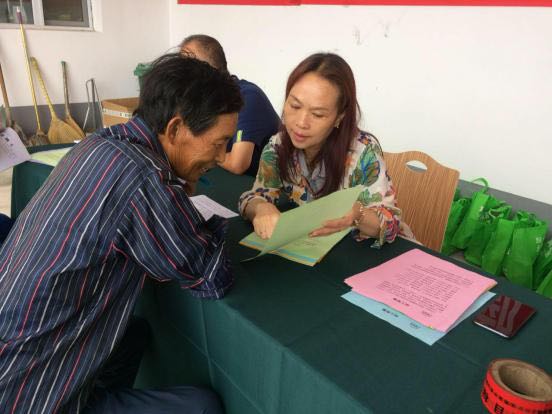 志愿者為農(nóng)村剩余勞動力介紹潔霸公司招工簡章 村民們認真閱讀招工簡章。