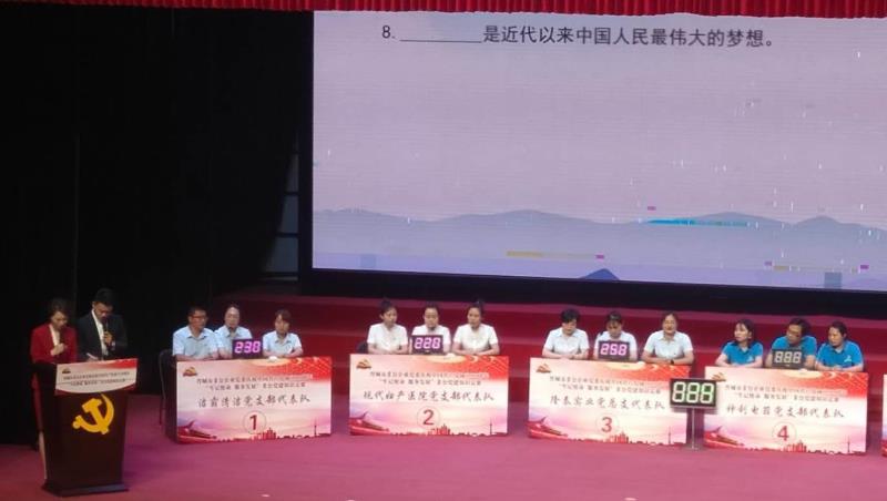 不忘初心跟黨走,牢記使命譜華章!為了慶祝中國共產(chǎn)黨成立99周年,6月28日下午,晉城市非公企業(yè)黨委在澤州天泰錦辰煤業(yè)有限公司職工文化宮進(jìn)行了一場別開生面的“牢記使命 服務(wù)發(fā)展”黨建知識競賽。潔霸清潔黨支部、現(xiàn)代婦產(chǎn)醫(yī)院黨支部、隆泰實(shí)業(yè)黨總支、神利電器黨支部、眾宸工貿(mào)黨支部和蔬菜公司黨支部等六支代表隊(duì)在此激戰(zhàn)正酣,各代表隊(duì)你追我趕,斗志昂揚(yáng),不甘落后,力爭上游,最終,我公司支部代表隊(duì)榮獲比賽三等獎(jiǎng)。