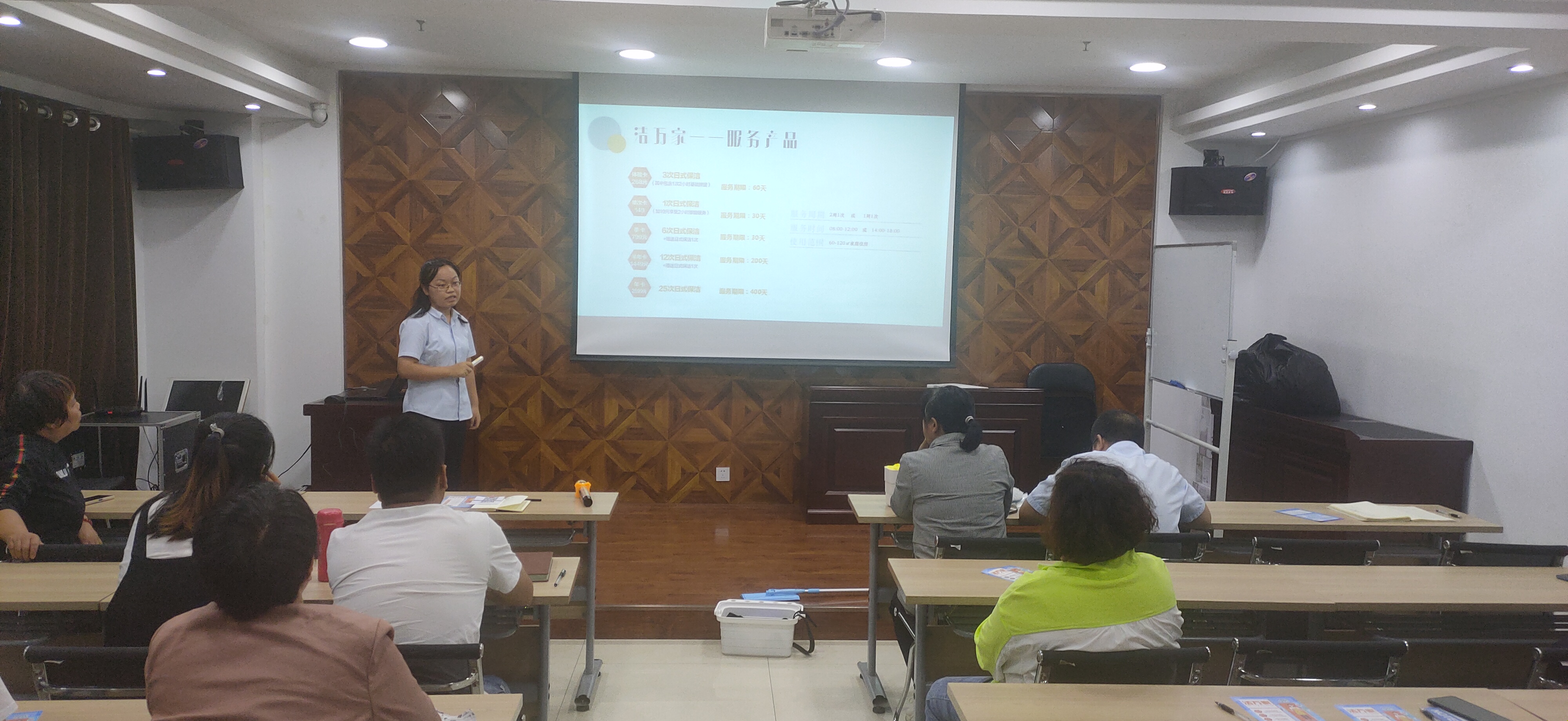 隨后由公司人力資源部負(fù)責(zé)人司夢(mèng)琴對(duì)“潔萬家”日常保潔產(chǎn)品進(jìn)行了分類介紹,此外還介紹了產(chǎn)品推廣獎(jiǎng)勵(lì)方案和推廣話術(shù),對(duì)大家日后推廣過程中會(huì)遇到的客戶提出的各種問題進(jìn)行了預(yù)設(shè)并一一詳細(xì)作答。