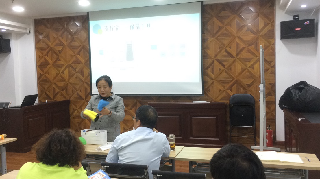 會(huì)議開場(chǎng),從福建福州取經(jīng)回來的人力資源部呂利清用簡短的一句話首先點(diǎn)出了“潔萬家”產(chǎn)品的亮點(diǎn)——“1人1次4小時(shí)日常保潔服務(wù)”,接著她從服務(wù)人員、服務(wù)時(shí)間、服務(wù)內(nèi)容、保潔工具、保潔流程等方面介紹了“潔萬家”日常保潔與年關(guān)保潔以及居家保潔的區(qū)別,并對(duì)服務(wù)內(nèi)容所涵蓋的6大區(qū)域(臥室、衛(wèi)生間、餐廳、客廳、廚房、陽臺(tái))以及專用8色保潔布的分類使用進(jìn)行了詳細(xì)的介紹。