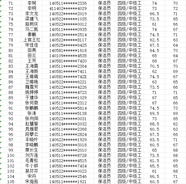 晉城市潔霸清潔服務(wù)股份有限公司職業(yè)技能等級認定中心現(xiàn)將2024年1月20日認定人員成績公示如下: