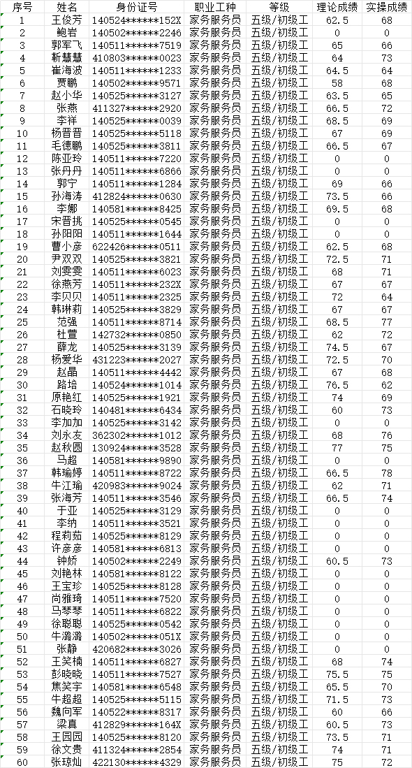 晉城市潔霸清潔服務(wù)股份有限公司職業(yè)技能等級(jí)認(rèn)定中心現(xiàn)將2024年7月7日認(rèn)定人員成績公示如下: