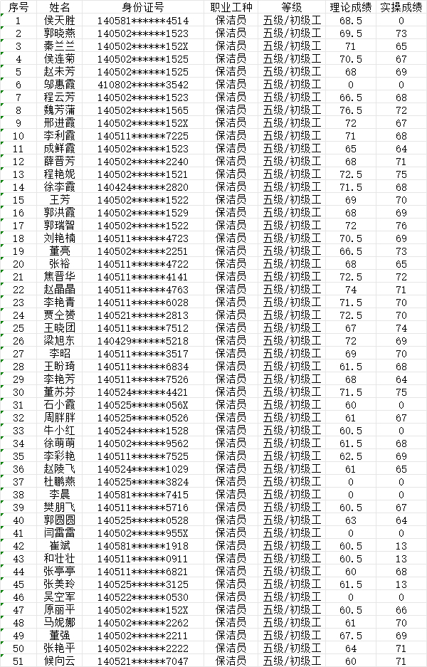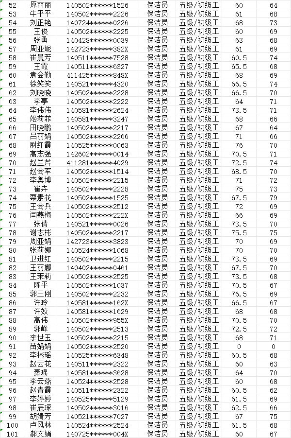晉城市潔霸清潔服務(wù)股份有限公司職業(yè)技能等級認(rèn)定中心2024年7月28日第26批保潔員初級認(rèn)定人員成績公示