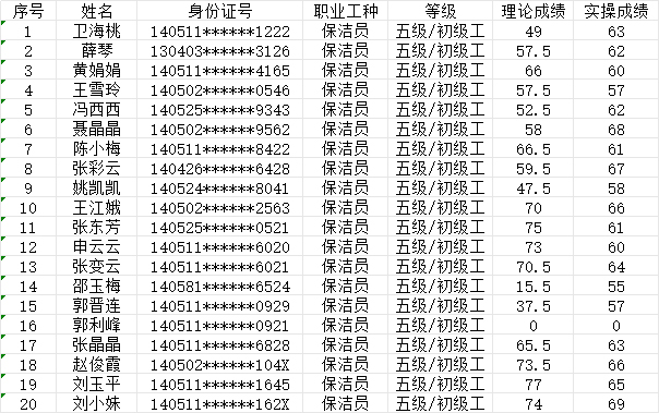 晉城市潔霸清潔服務(wù)股份有限公司職業(yè)技能等級(jí)認(rèn)定中心現(xiàn)將2024914日認(rèn)定人員成績公示如下: