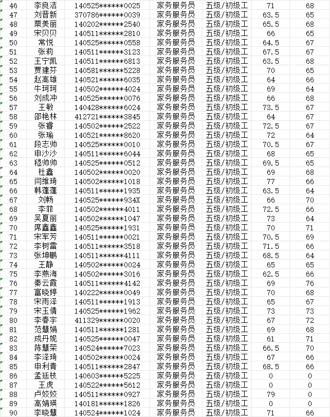 晉城市潔霸清潔服務(wù)股份有限公司職業(yè)技能等級(jí)認(rèn)定中心2024年9月28日第40批家政服務(wù)員初級(jí)認(rèn)定人員成績(jī)公示